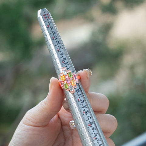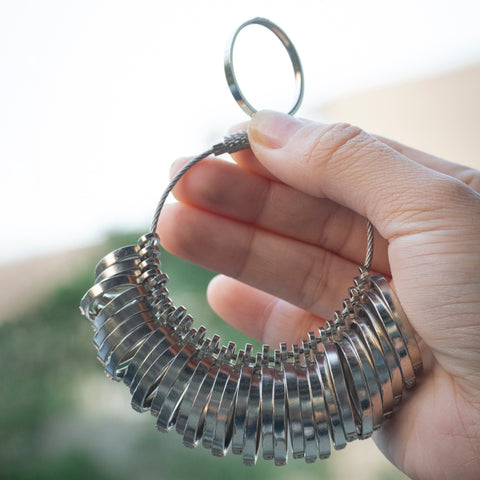 - Visit your local jeweller and ask to have your fingers measured with their ring gauge. This will be the most accurate method and most jewellers will be happy to advise you on ring sizing options and best fit practices. You will want the ring to fit snugly once it is on and to have a slight grip on the finger when getting it get back off over the knuckle. Alternatively, if you’re buying a ring for someone else, you (sneakily) can borrow one of their rings and bring it to the jeweller to size on a mandrel. This is accurate as long as the ring you borrow is for the same finger you want to buy the new ring for. It is also important to note that the width of the ring you borrow is similar to the one you are looking to purchase.