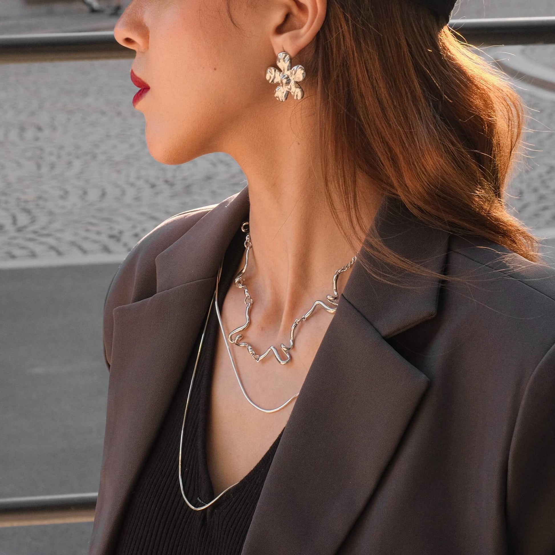 Inspired by the graceful motion of a dancer’s ribbon, this gold or silver necklace flows in sculptural waves. Light and fluid on its own, striking when layered—a quiet statement of movement and modern poise.