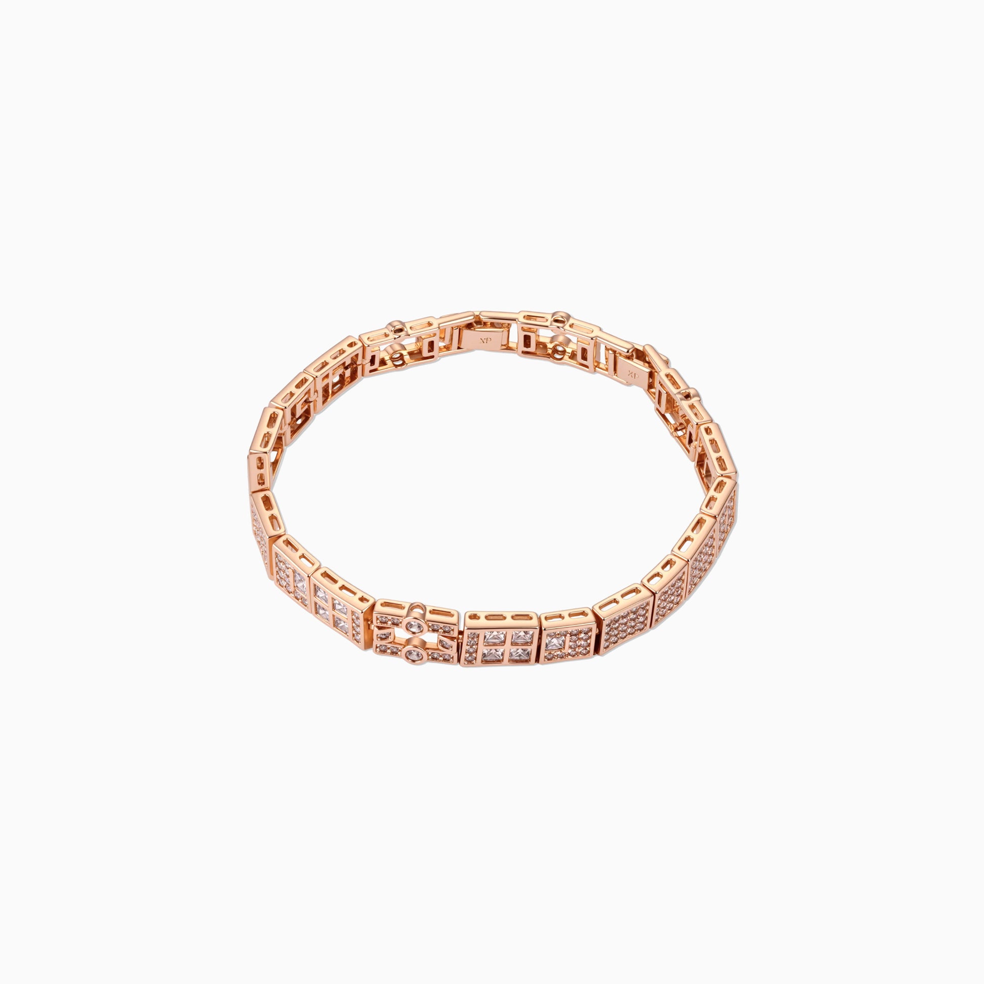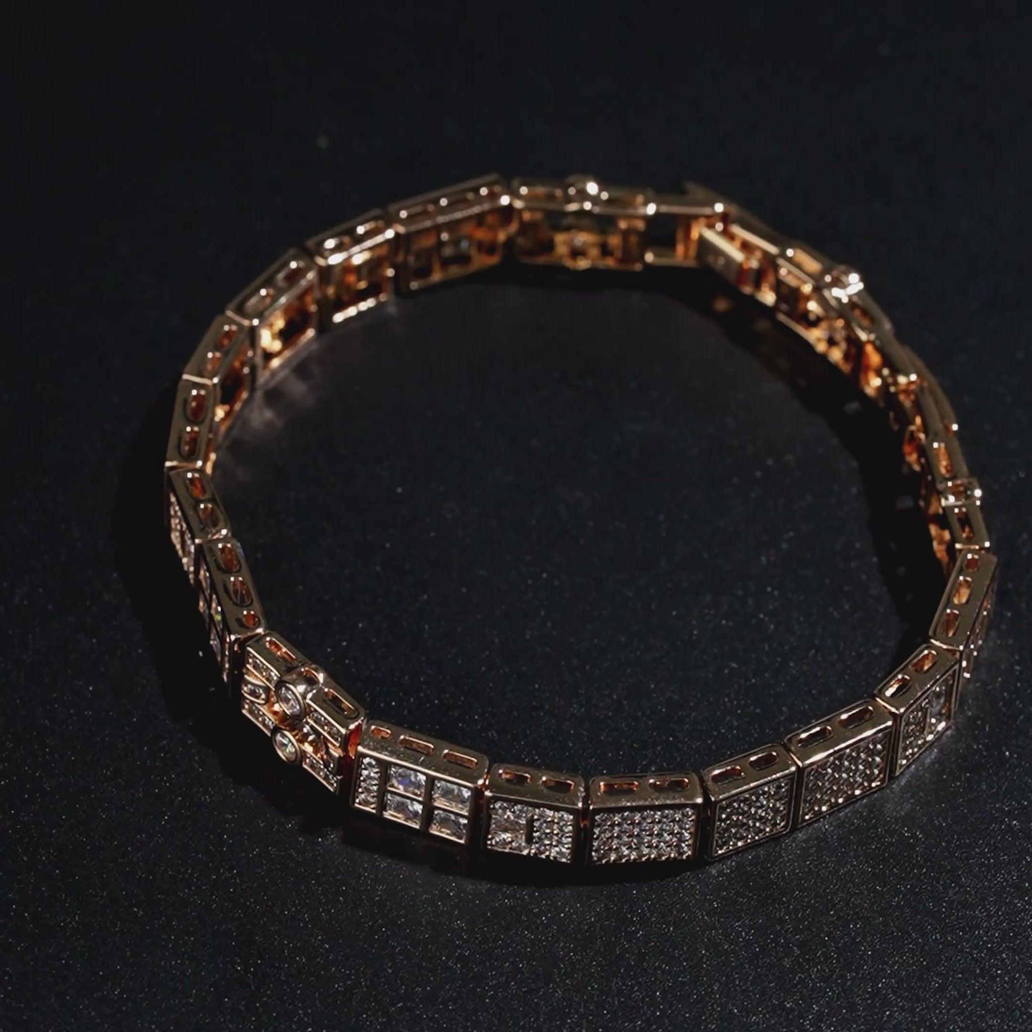 This bracelet blends modern structure with high-glam sparkle, creating a piece that feels both architectural and effortlessly luxurious. Its design features a continuous line of geometric links—rectangles, squares, and slim bars—each meticulously set with brilliant pavé crystals.