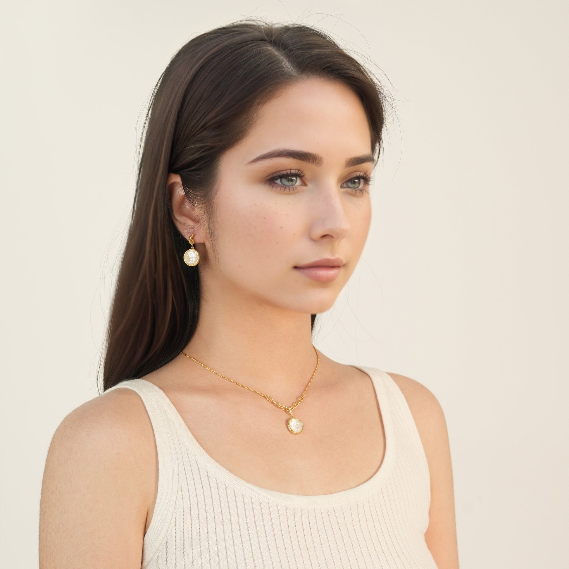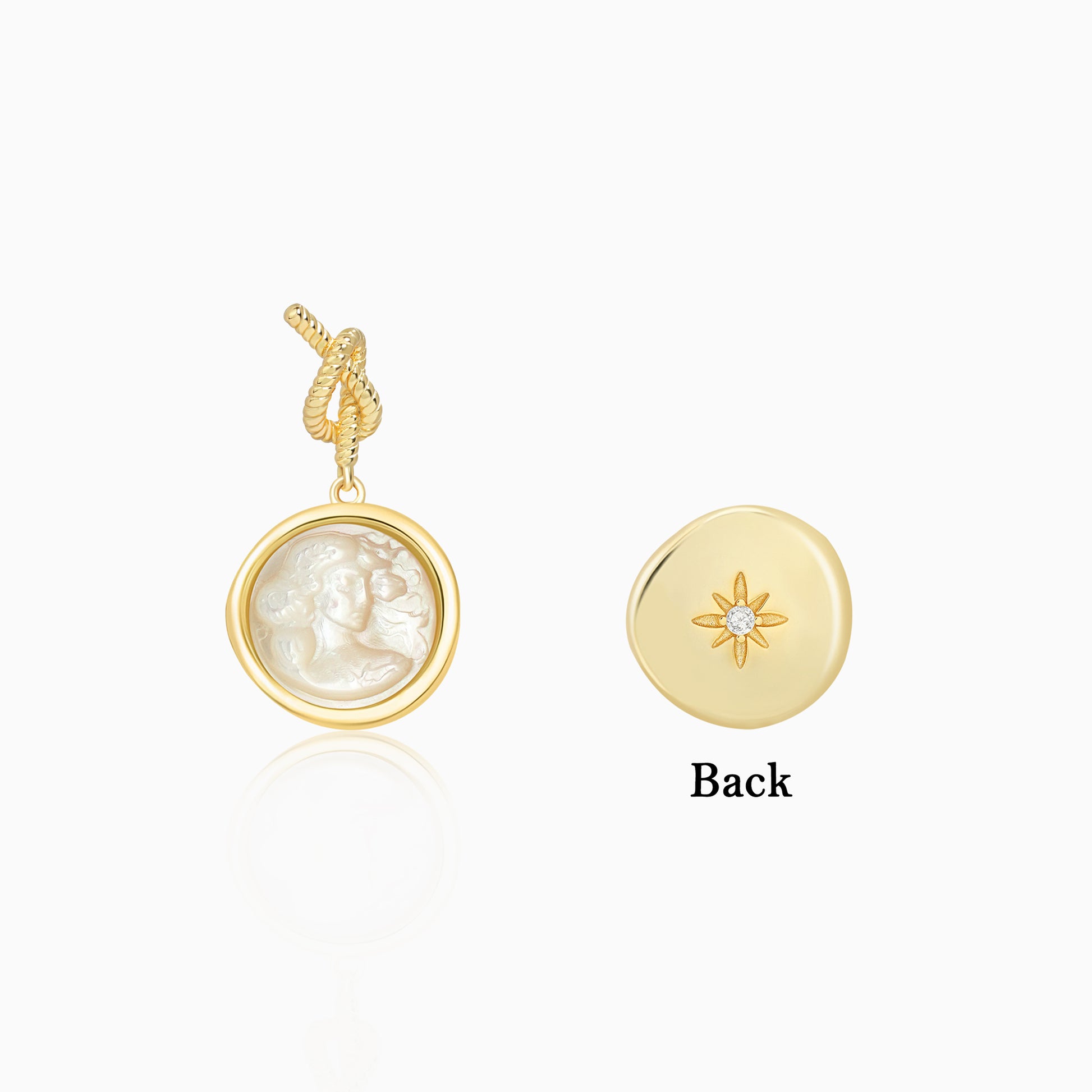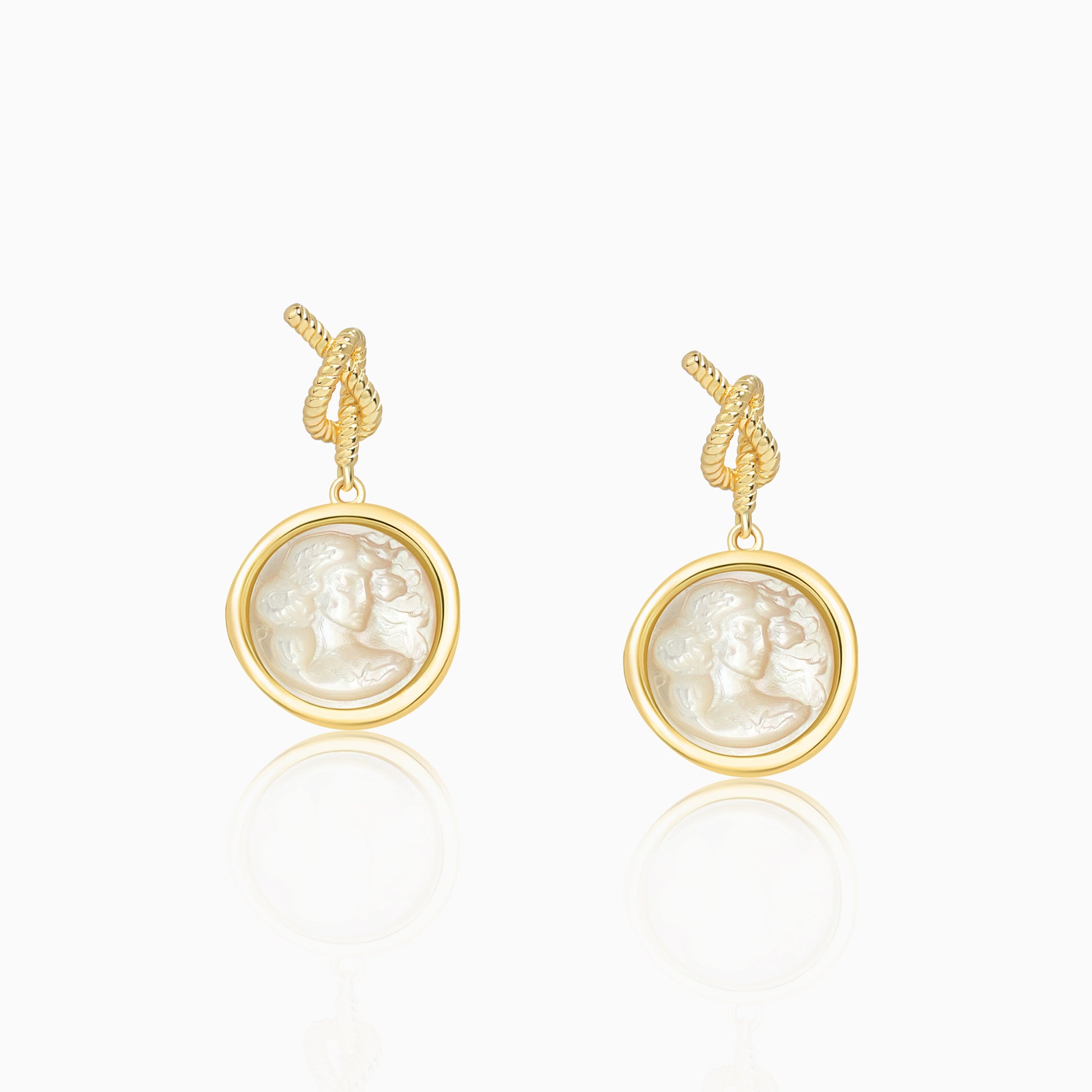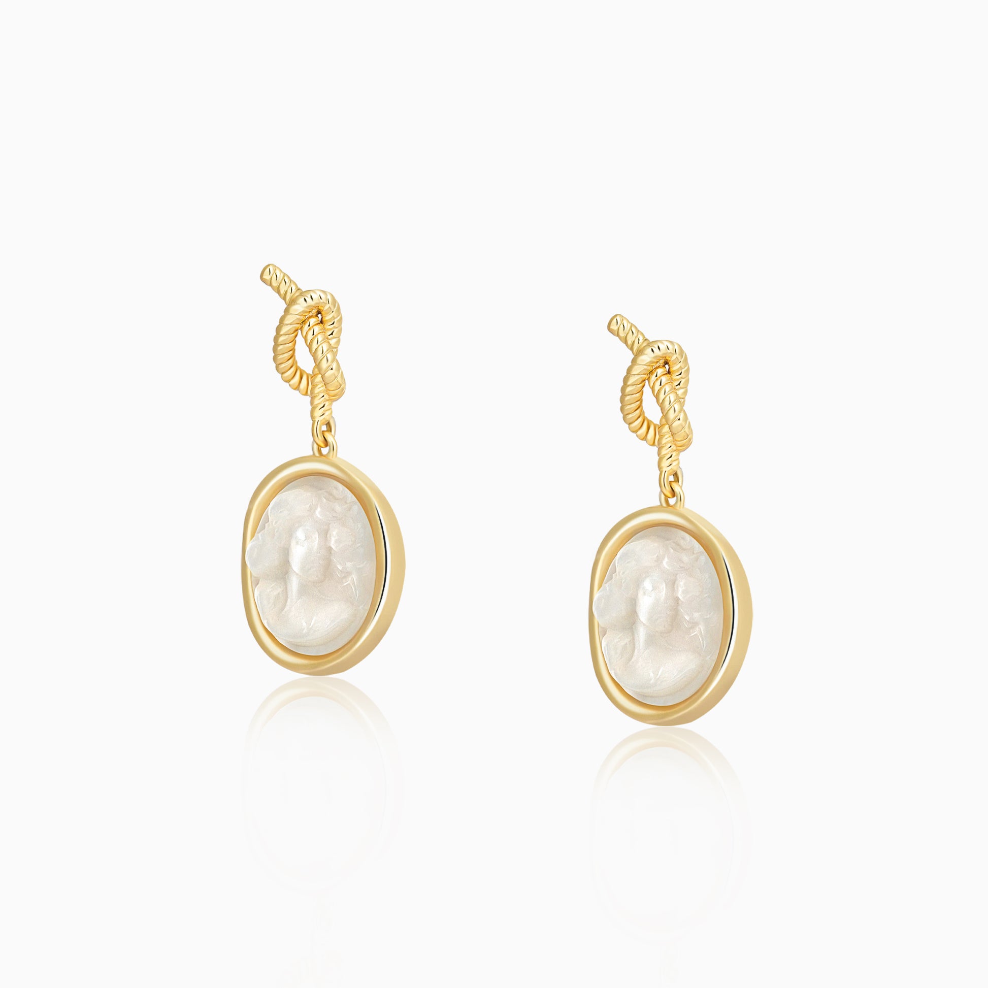 Carved mother‑of‑pearl profiles of a love goddess gleam with rose‑gold opalescence, paired with knot‑inspired studs that evoke ancient Greek vows—together marrying vintage ritual with modern elegance.